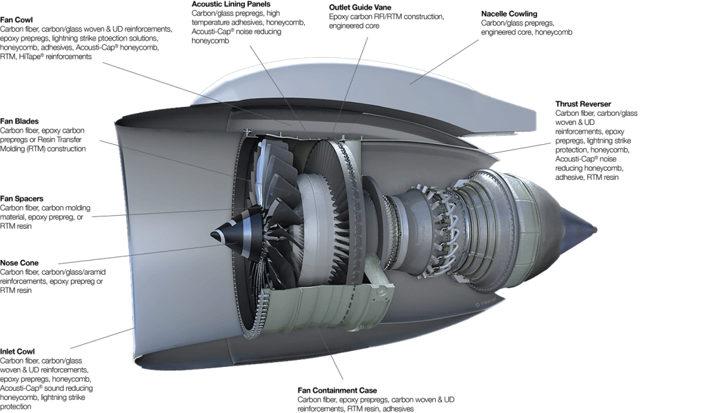 Nacelle manufacturers were the first to adopt significant amounts of composite materials. By the 1970s, designers had turned to composites for the weight savings necessary for the large nacelles required by the new generation of large high power turbofans. Today’s nacelles are made primarily from a variety of composite materials rather than metals not only to save weight, but also to provide superior sound protection and the benefits of lower maintenance. Composite materials made from carbon and glass fibers, aramid papers and high temperature resins have revolutionized the way the modern nacelle is constructed. Carbon fiber epoxy prepregs account for typically half the volume of the entire nacelle structure including the inlet cowl, fan cowl, and thrust reverser. Toughened epoxy prepregs, such as Hexcel’s HexPly® 8552 and HexPly® M91 epoxy matrices, are recommended for structural applications which require high strength, stiffness, and impact tolerance.